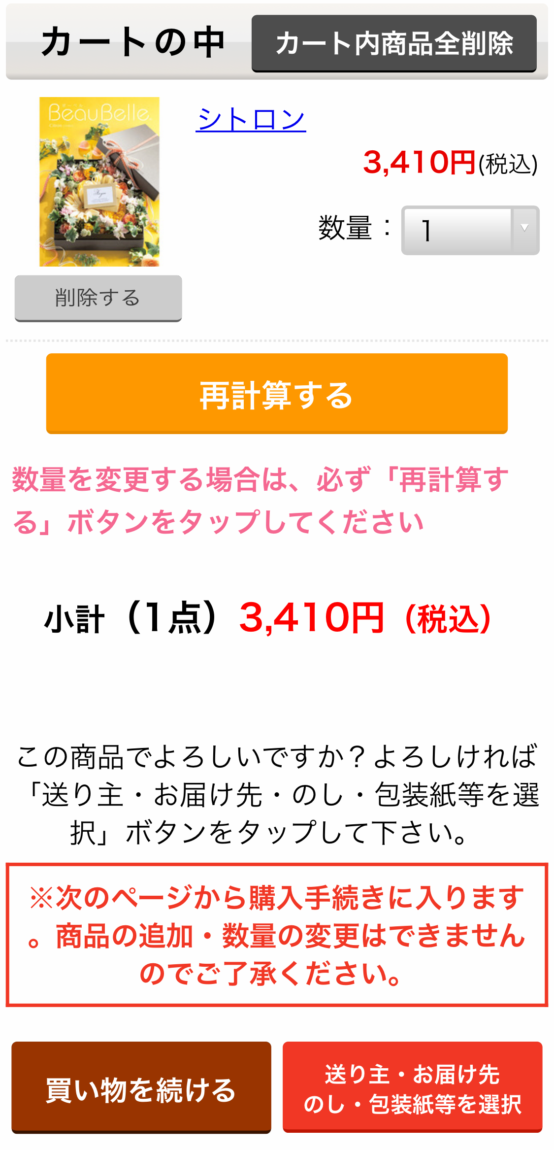 商品ごとに数量に変更がある場合は、必ず「再計算する」ボタンをタップしてください。