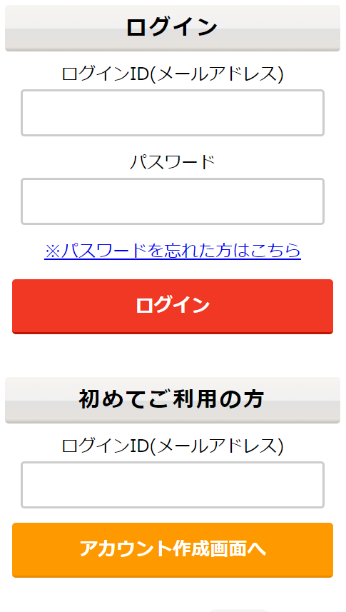 初めてご利用の方は、ログインID(メールアドレス)を入力後、『アカウント作成画面へ』ボタンをタップしてください。