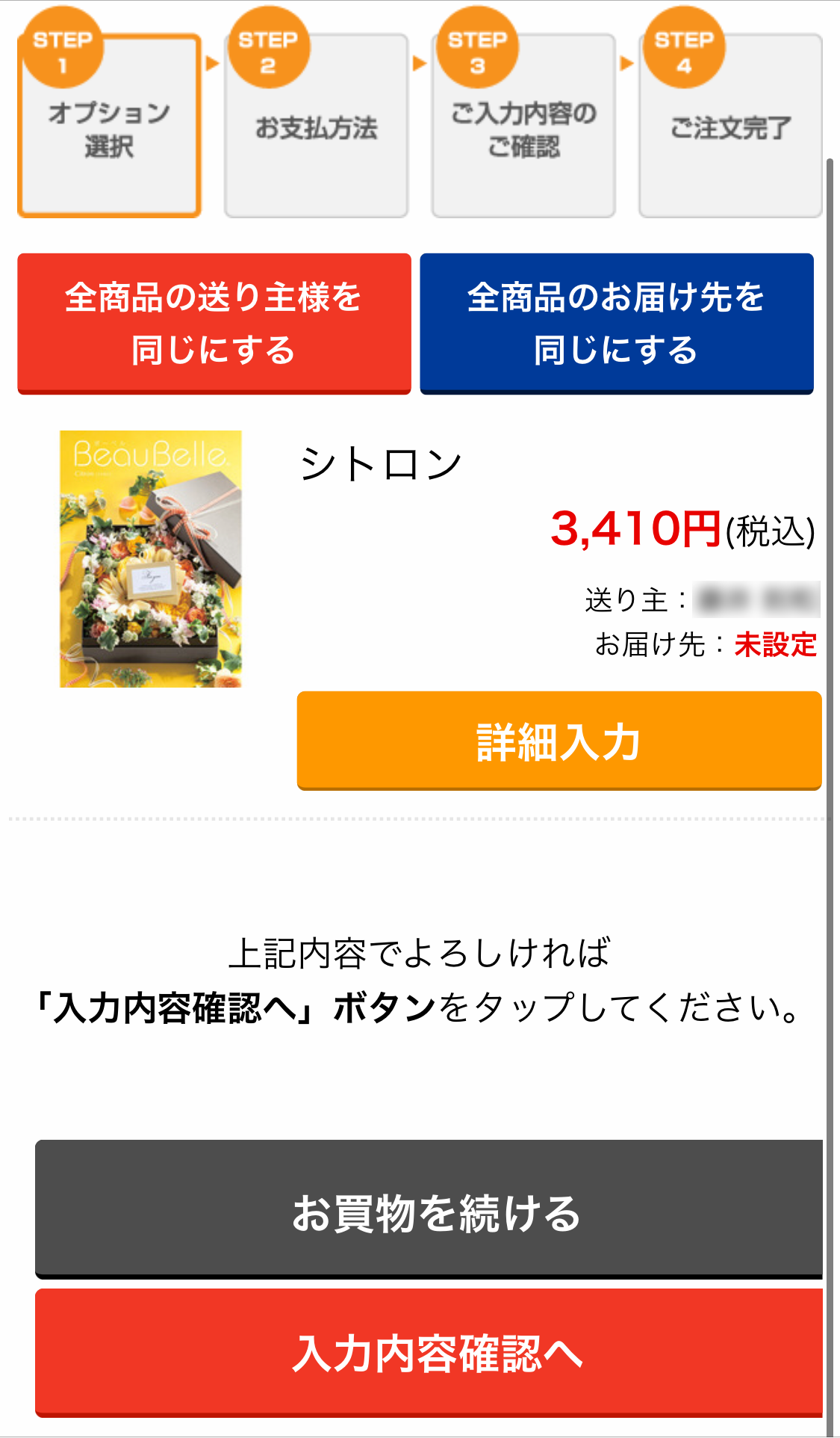 4. 4.「詳細入力」ボタンをタップし、オプション(送り主様・お届け先・包装紙・のし・備考など)を選択・入力し、