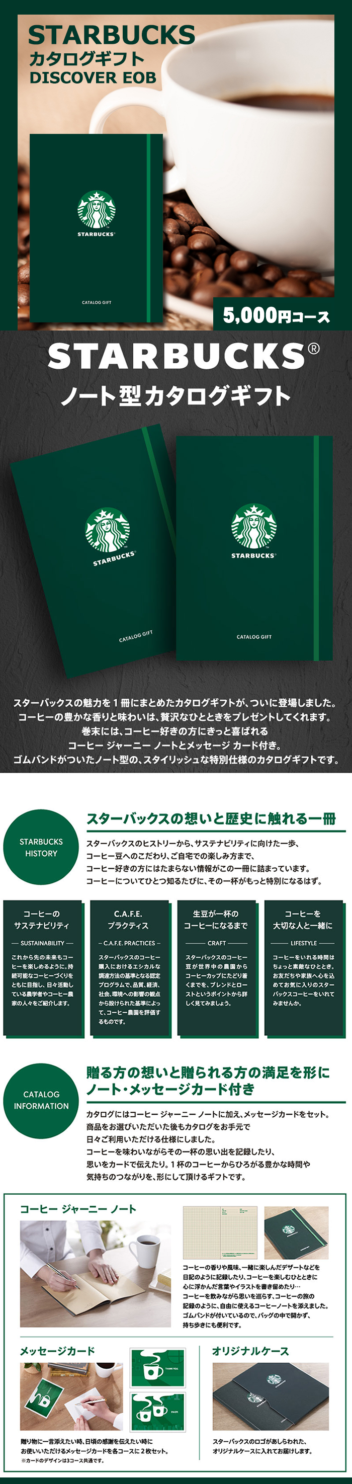 商品説明 スターバックスの魅力を1冊にまとめたカタログギフトが、ついに登場しました。コーヒーの豊かな香りと味わいは、贅沢なひとときをプレゼントしてくれます。巻末には、コーヒー好きの方にきっと喜ばれるコーヒージャーニーノートとメッセージカード付き。ゴムバンドがついたノート型のスタイリッシュな特別仕様のカタログギフトです。